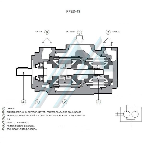 PFED sind doppel-pumpen - fördermenge: sie bestehen aus zwei kassetten - bomben vom typ PFE-assemblys werden in einem hauptteil mit einem eingangsport und zwei ausgangsports.