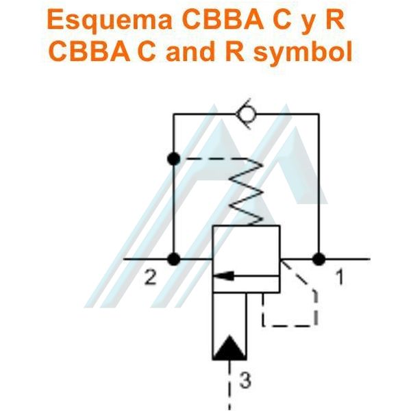 The non-return valve allows free flow from the directional valve (2) to pressure (1) while a direct, pilot-operated discharge valve controls the flow from 1 to 2. The pilot (3) lowers the effective setting of the discharge valve to a value determined by the piloting ratio.