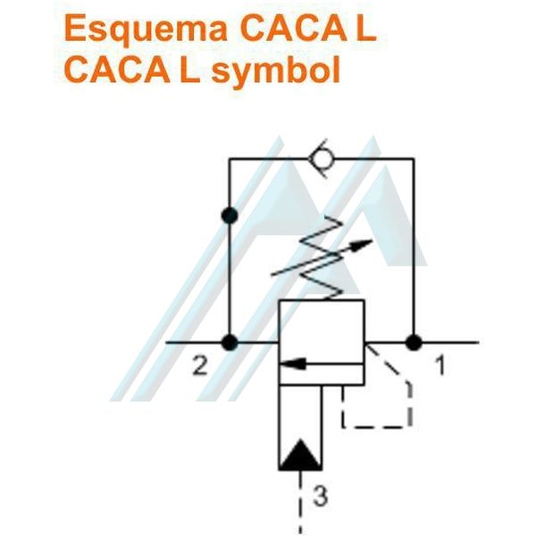 The non-return valve allows free flow from the directional valve (2) to pressure (1) while a direct, pilot-operated discharge valve controls the flow from 1 to 2. The pilot (3) lowers the effective setting of the discharge valve to a value determined by the piloting ratio. The back pressure at 2 does not affect the valve setting because the spring chamber has atmospheric reference.