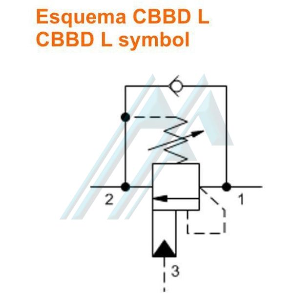 The non-return valve allows free flow from the directional valve (2) to pressure (1) while a direct, pilot-operated discharge valve controls the flow from 1 to 2. The pilot (3) lowers the effective setting of the discharge valve to a value determined by the piloting ratio.
