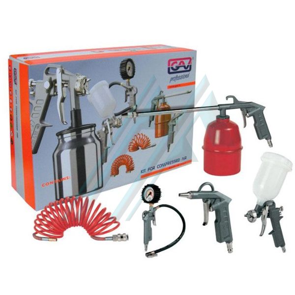 Complete kit of professional spray guns: blow gun, oil, inflator, paint gun and 5 m 6x8 nylon spiral. .With UNI type quick plug and UMU type adapters.