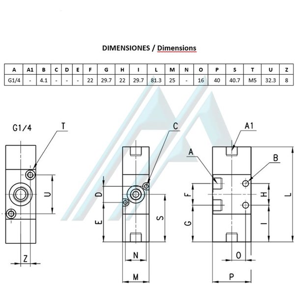 5/2-way pneumatic valve, G 1/4 ports, bistable