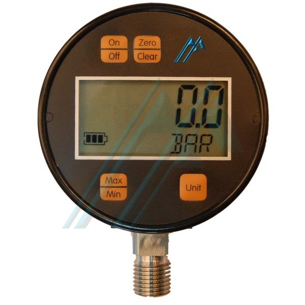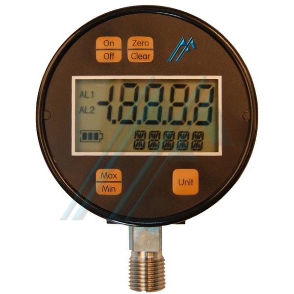 Manómetro digital compacto con una precisión del 0,2%y bajo consumo.Lapresión se mide y se muestra cuatro veces por segundo. La pantalla superior muestra la presión actual (o la presión máxima o mínima en el modo de función máxima o mínima).La pantalla inferior muestra el modo en el que se encuentra el dispositivo (las unidades de la presión actual, presión máxima o presión mínima).El manómetro digital compacto tiene 4 botones:1.Botón “ON/OFF”. Enciende y apaga el dispositivo.2.Botón “Zero/Clear”. Con el manómetro en el modo medición, pulsa el botón para poner la pantalla a cero.3.Botón “Max/Min”. Selecciona el modo presión máxima, presión mínimay presión actual.El valor máximo y mínimo será eliminado pulsando este botón durante unos segundos y ambos valores serán eliminados al apagar el dispositivo.4.Botón “Unit”. Con este botón selecciona la unidad en la que se mostrará la presión entre 9 unidades (bar, psi, pulgadas de columna de mercurio,centímetros de columna de agua, pulgadas de columna de agua, pies de columna de agua,kg/cm2y kPa).Especificaciones:Rango: 0...100 mbar, 0...160 mbar, 0...400 mbar, 0...600 m barMaterial de la caja: Plástico ABSPrecisión: ± 0,2 % FEPresión límite: 1,5 veces el rangoEfectos térmicos: 0.025 % FE / ºCTemperatura de almacenaje: -20...70 ºCTemperatura ambiente: 0...50ºCFuente de alimentación: 2 pilas AAADuración de la batería: Más de 1.000 horasTipo de conexión: ¼” BSP de acero inoxidableTamaño: 69 x 38.1 mmPeso: 200 g