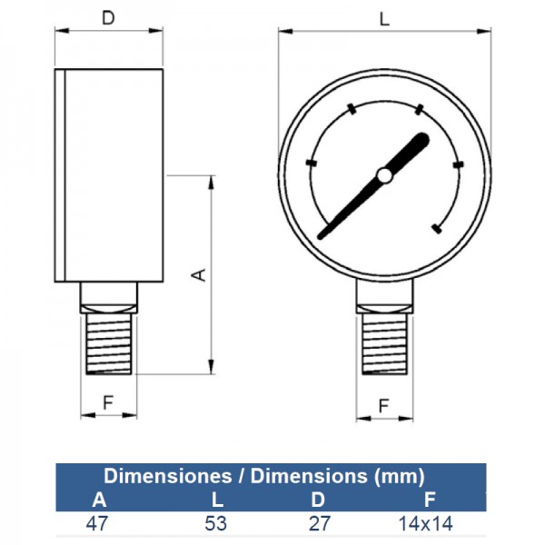 Manómetro con conexión radial inferior, rosca macho (BSP) G 1/4" según ISO 228/1.