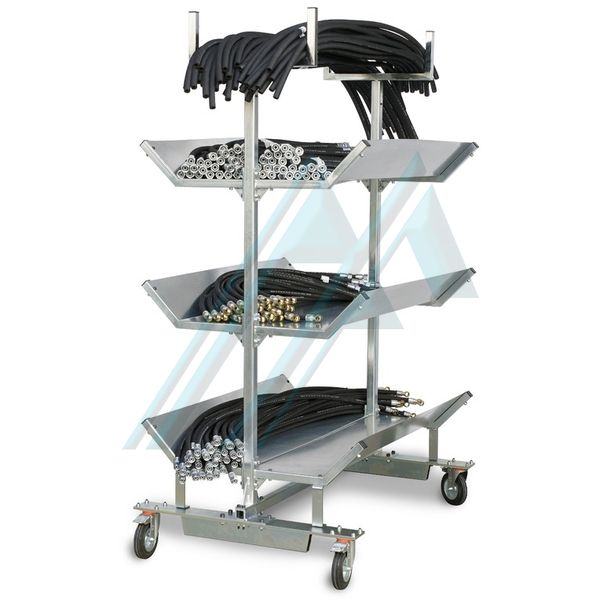 Este cómodo y resistente porta mangueras está dotado de ruedas que facilitan el desplazamiento; es el soporte ideal para su sección de empalmes y conectores.