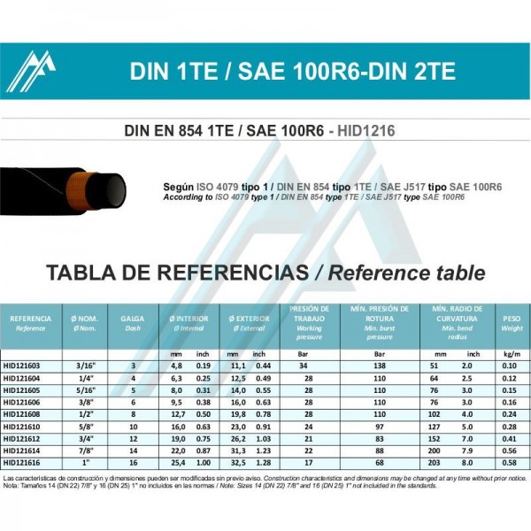 Tubo esterno: gomma sintetica resistente all'abrasione, agli agenti atmosferici e agli oli.