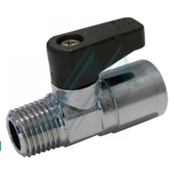 NBRシール付きミニチュアバルブ。 20バールの公称圧力。真鍮/ブロンズボディ。クロームボール。テフロン席。黒のアセタール樹脂ハンドル。