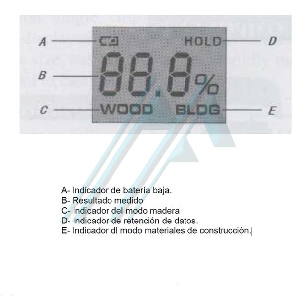 5. Sob o modo de materiais de construção, a leitura é exibida na tela LCD, com um intervalo de 1.5%~33%. se o intervalo é inferior a 1.5%, a tela mostrará e quando for superior a 33%, a tela mostrará.