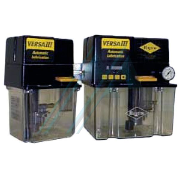Группа VERSA III отлично адаптирована для использования объемных маслозаборников. Он состоит из насосного агрегата с шестеренчатым электродвигателем и полупрозрачного пластикового резервуара, оборудованного регулятором минимального уровня. При установке с баком на 2 литра он может быть оснащен двойным таймером для регулирования частоты циклов. При установке с 4-литровым баком он может быть оснащен электронным модулем, который обеспечивает автономную работу, предлагая комплексный контроль системы (управление циклами, контроль уровня масла и рабочее давление).