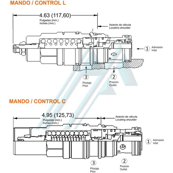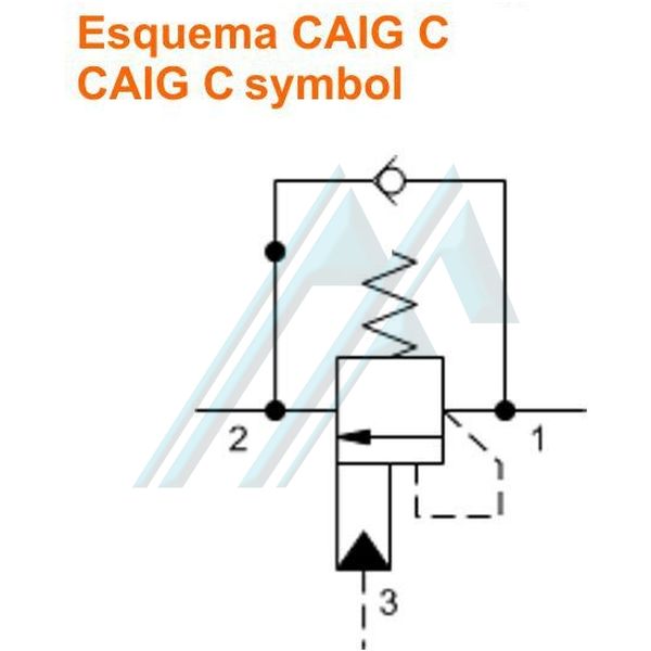 Обратный клапан обеспечивает свободный поток от направляющего клапана (2) к давлению (1), в то время как прямой нагнетательный клапан с пилотным управлением регулирует поток от 1 до 2. Пилот (3) понижает эффективную настройку нагнетательного клапана до значение, определяемое передаточным числом пилотирования. Противодавление на 2 не влияет на настройку клапана, потому что камера пружины имеет атмосферное давление.